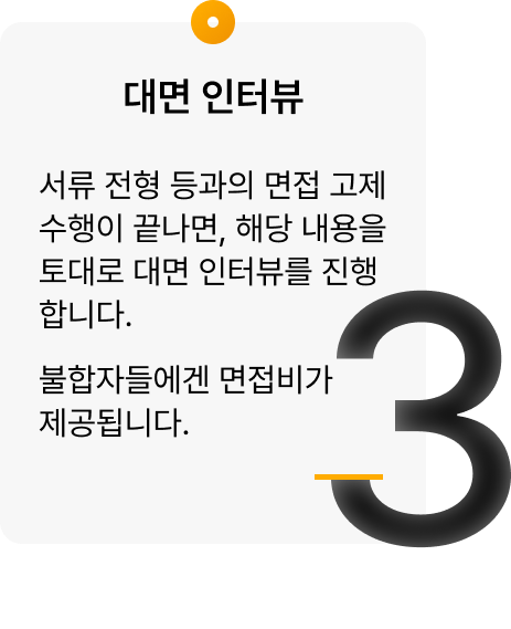 서류 전형 통과와 면접 과제 수행이 끝나면, 해당 내용을 토대로 대면 인터뷰를 진행합니다. 불합자들에겐 면접비가 제공됩니다.