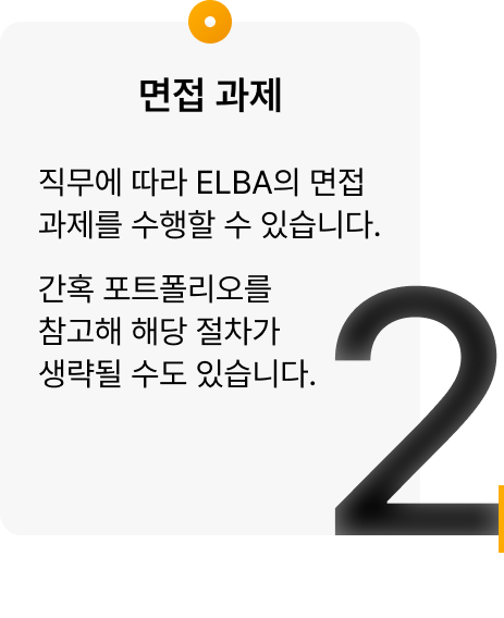 직무에 따라 ELBA의 면접 과제를 수행합니다. 간혹 포트폴리오를 참고해 해당 절차가 생략될 수도 있습니다.