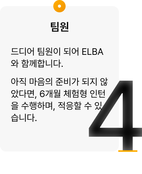 드디어 팀원이 되어 ELBA와 함께합니다. 아직 마음의 준비가 되지 않았다면, 6개월 체험형 인턴을 수행하며, 적응할 수 있습니다.